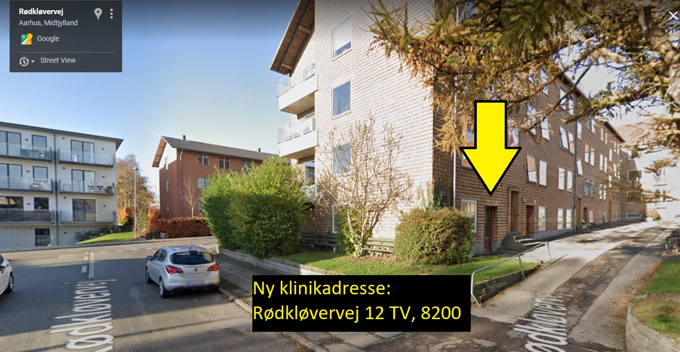 Du finder min klinik på den nye adresse: Rødkløvervej 12, 8200 Aarhus N. Jeg er i et klinikfællesskab med andre dygtige psykologer. Du har derfor tilgang til venteværelse og toilet.